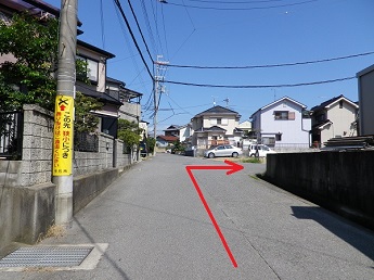 ![]() 坂を下りると今度は上り坂になり、丁字路に出ます。 その丁字路を右折して下さい。 |
