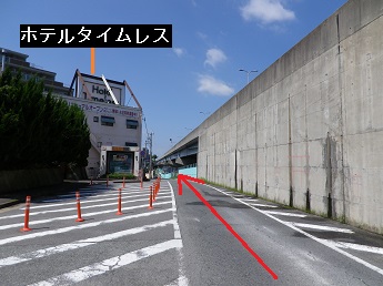 ![]() 側道へ入り、下り坂を西へ直進します。 左側に『ホテルタイムレス』があります。 (ここの一旦停止はよく警察が取り締まってますので、必ず止まってください) |