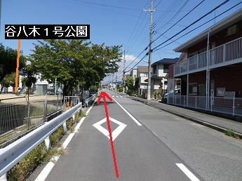 ![]() 直進すると左側に谷八木1号公園があります。 そこを通過し、さらに北へ直進します。 |
