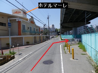 ![]() さらに西へ直進すると左側に『ホテルマーレ』が見えてきます。 そこの丁字路を右折し、北へ直進します。 |