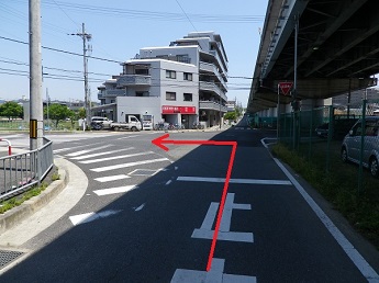 ![]() 側道の下り坂を下り、一つ目の信号を左折し、北へ直進します。 |