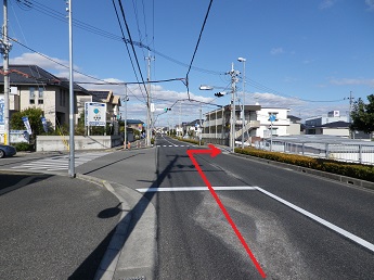 ![]() 北上すると一つ目の交差点が見えてきます。 信号を右折します。 |