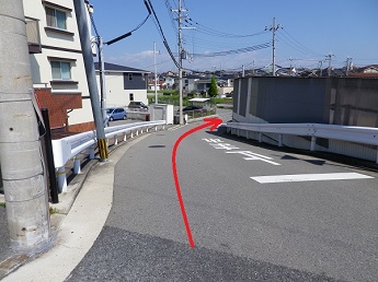 ![]() 側道の下り坂を下り、一つ目の信号を左折し、北へ直進します。 |
