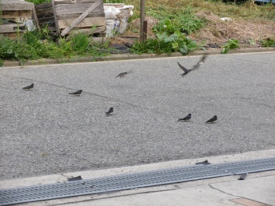 朝、1羽の雛が巣から離れてカラス除けネットに泊まっていました。 いよいよ巣立ちするのでしょう。 たくさんのツバメが飛んできています。 普段はあまり地面に下りないそうですが、何匹も地面にいました。 |